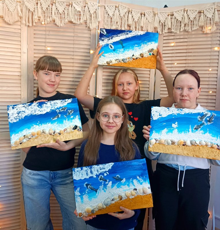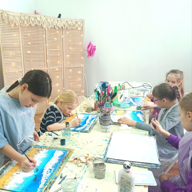 Дочку полностью устраивают занятия в арт-студии, которые ей интересны. Поскольку ребенок любит море, морская тема последнего занятия оказалась ей близка, дети рисовали картины с песком, камнями и дельфинами. Так что дочь довольна занятиями!